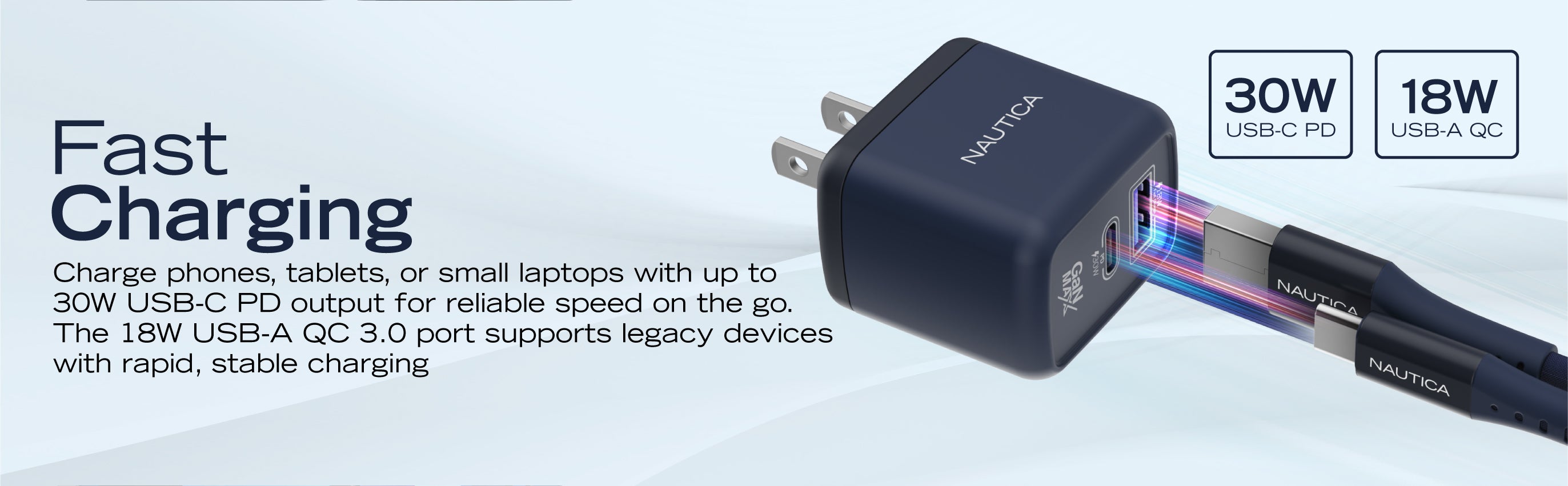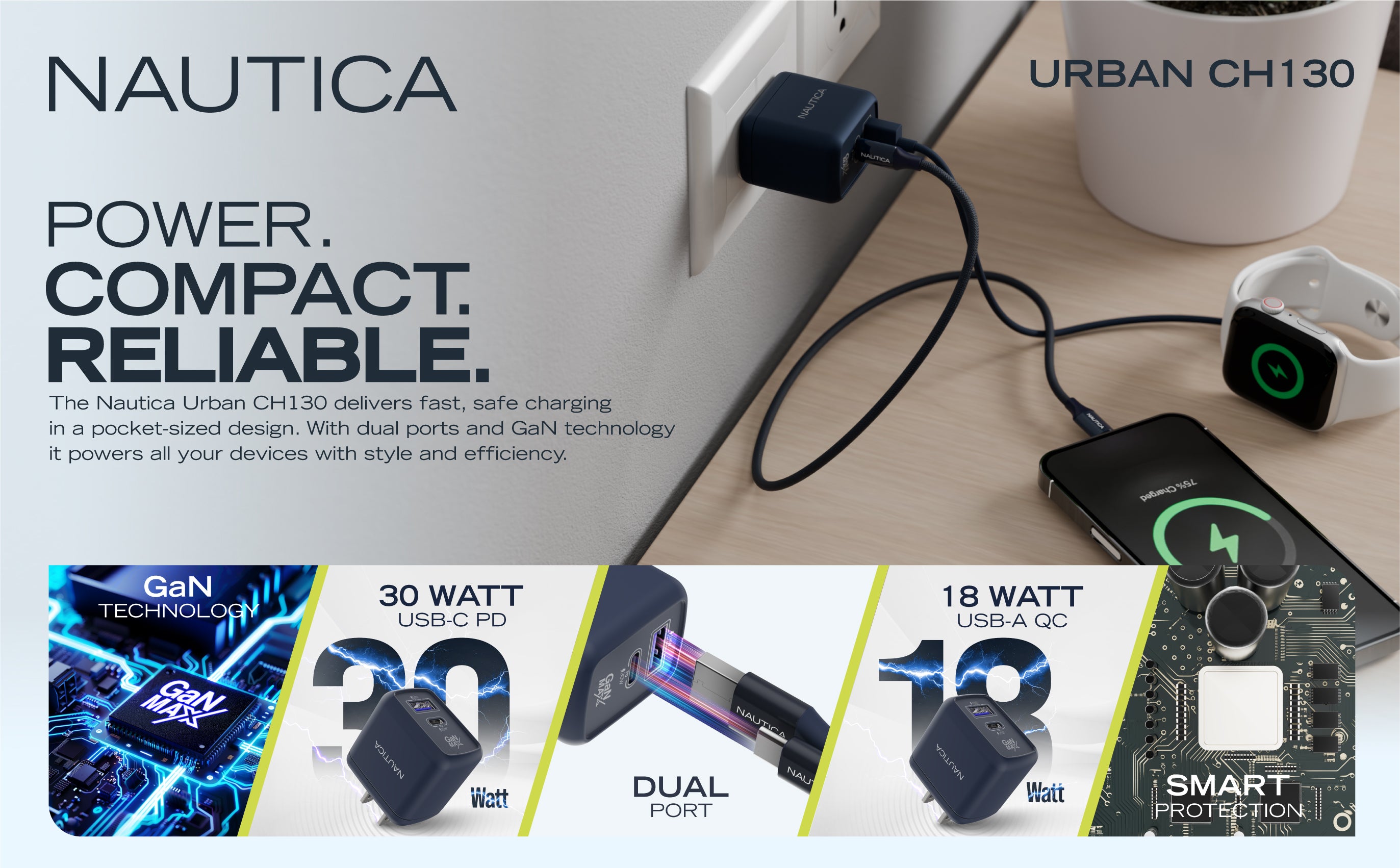 Some key features of the Nautica 30W Dual Port Wall Charger include:
