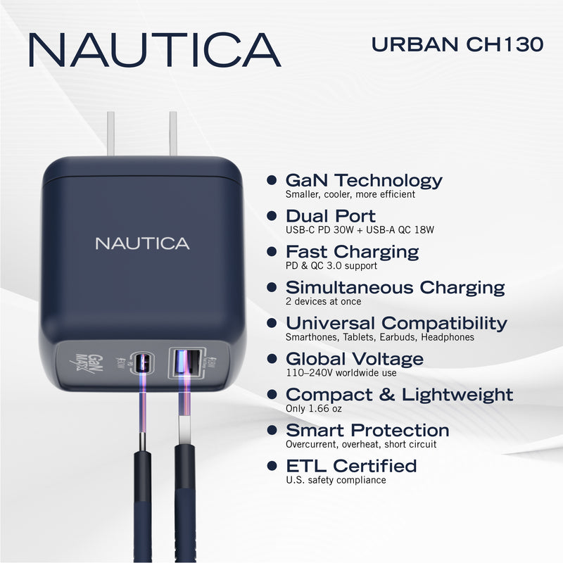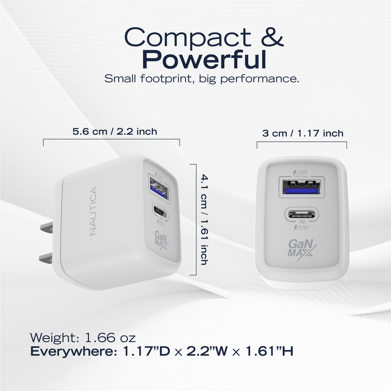 Nautica 30W Dual Port Wall Charger – USB-C & USB-A Fast Charging Adapter for iPhone, Samsung, Android Devices