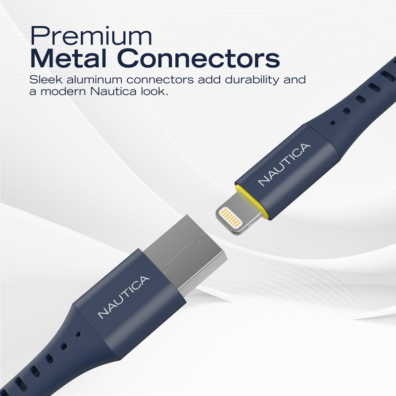 The Nautica C65 USB-A to Lightning MFi-certified cable is the perfect blend of high performance and stylish design. Available in 4 feet, 6 feet, and 10 feet lengths, it ensures flexibility and convenience wherever you need it. Featuring a braided fabric cover, this cable is built to be durable and reliable, ready to handle your busy lifestyle while looking great.