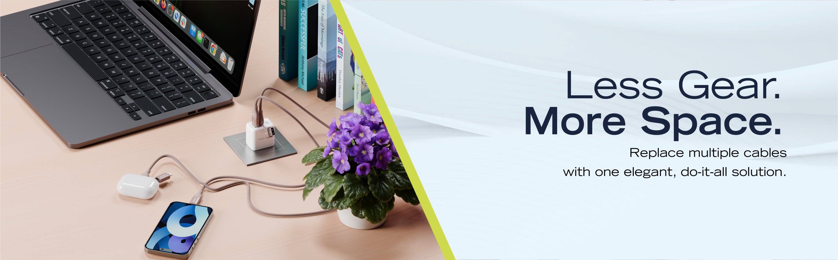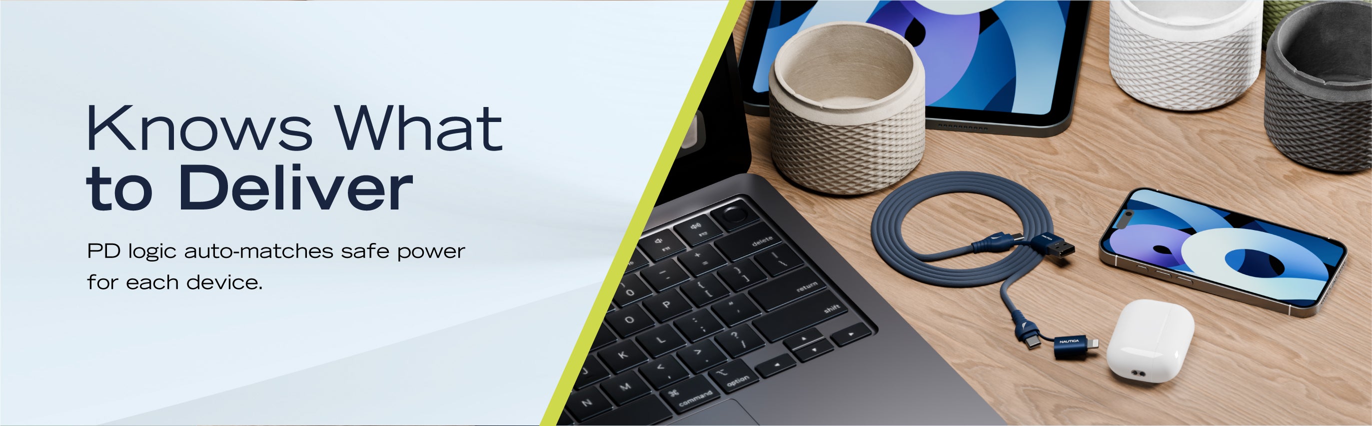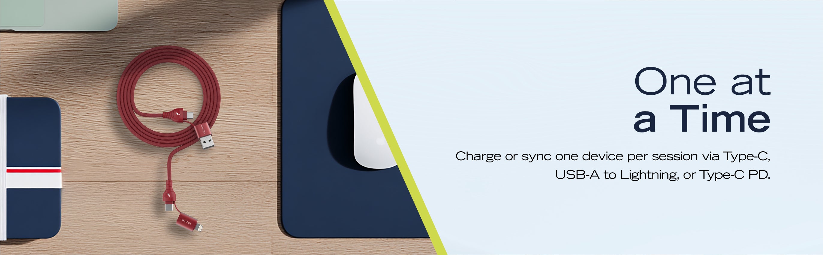The Nautica CB400 is an MFi-certified 4-in-1 cable designed to simplify your charging and syncing needs. With a sleek design, it combines USB-C, USB-A to Lightning, and Type-C PD support all in one cable. Say goodbye to clutter and carry just one cable for all your devices, whether it's your phone, tablet, laptop, or wireless earbuds. With 100W maximum power*, it charges your devices quickly and efficiently, offering ultimate convenience. The premium woven fabric cover and high-quality aluminum connectors ensure durability and style, making it the perfect companion for any tech enthusiast.