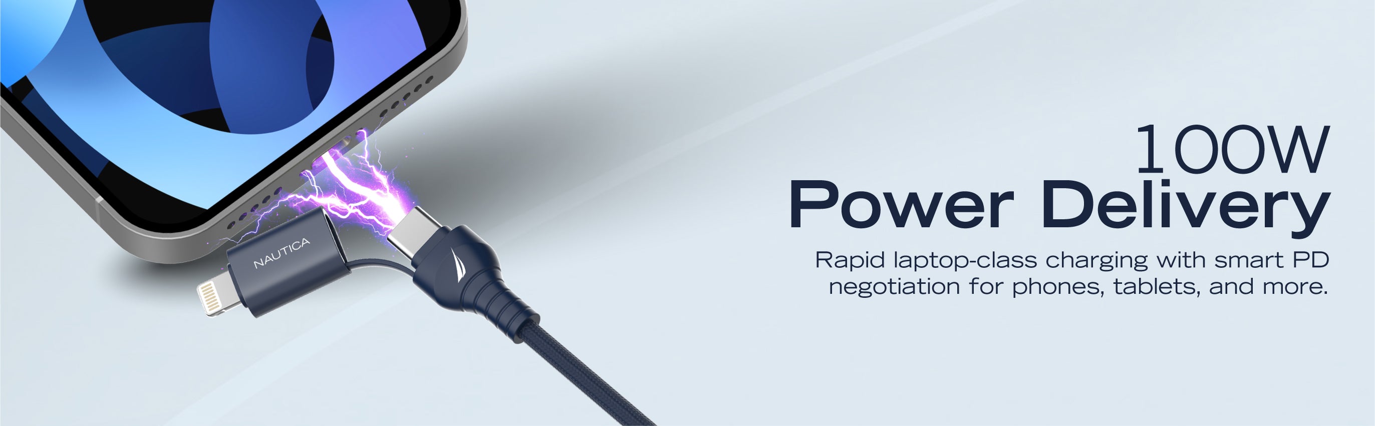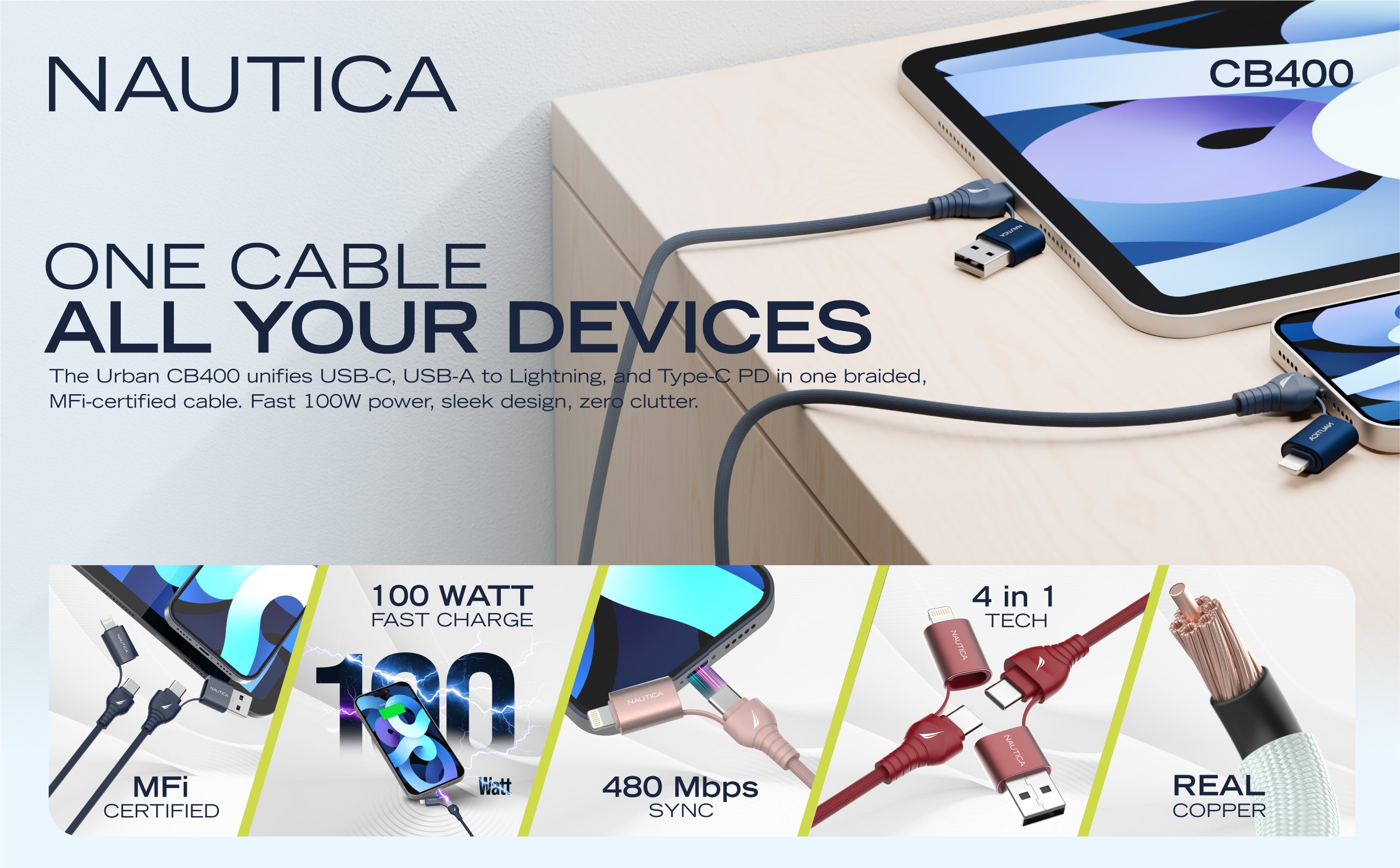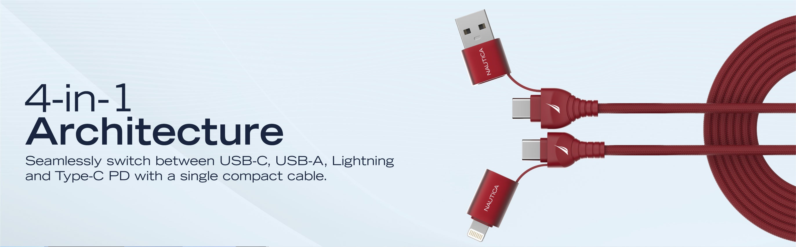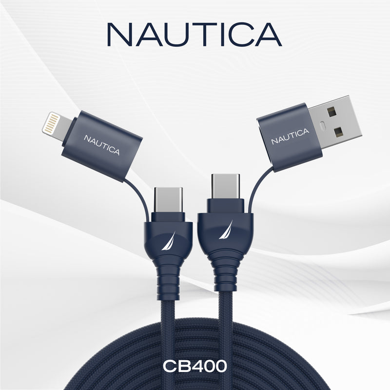 The Nautica CB405 is the ultimate all-in-one charging and syncing solution. This MFi certified 4-in-1 cable combines USB-C, USB-A to Lightning, and Type-C PD support in one sleek, compact design. No more carrying multiple cables, charge your phone, tablet, laptop, and wireless earbuds with just one cable. With a maximum power delivery of 100W*, the CB405 ensures fast and efficient charging for all your devices. Made with a durable woven fabric cover and high-quality aluminum connectors, this cable is built to last while staying stylish. Say goodbye to clutter and hello to convenience with the Nautica CB405, the only cable you’ll ever need for all your charging needs.