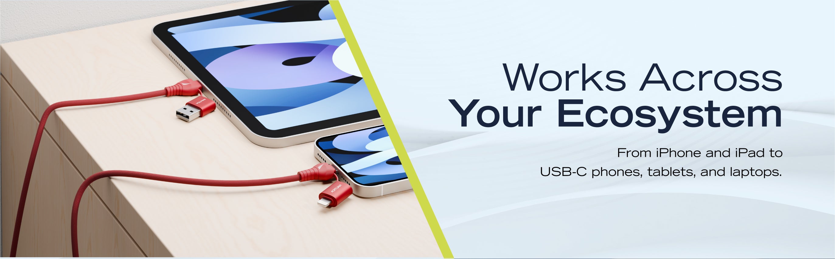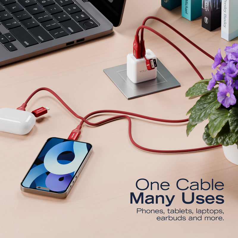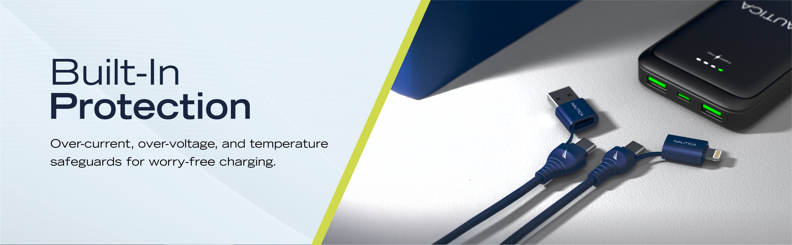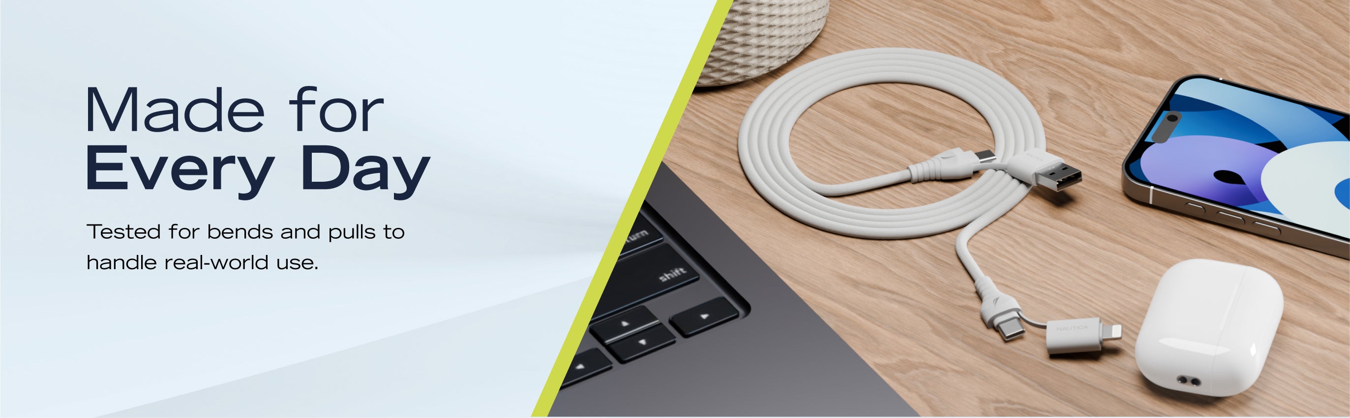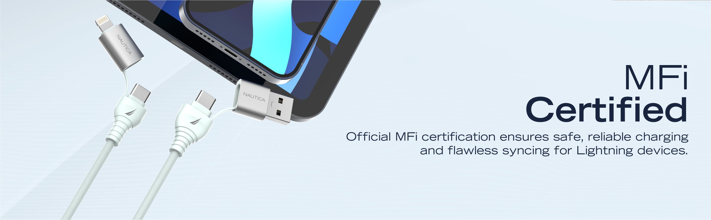 The Nautica CB405 is the ultimate all-in-one charging and syncing solution. This MFi certified 4-in-1 cable combines USB-C, USB-A to Lightning, and Type-C PD support in one sleek, compact design. No more carrying multiple cables, charge your phone, tablet, laptop, and wireless earbuds with just one cable. With a maximum power delivery of 100W*, the CB405 ensures fast and efficient charging for all your devices. Made with a durable woven fabric cover and high-quality aluminum connectors, this cable is built to last while staying stylish. Say goodbye to clutter and hello to convenience with the Nautica CB405, the only cable you’ll ever need for all your charging needs.