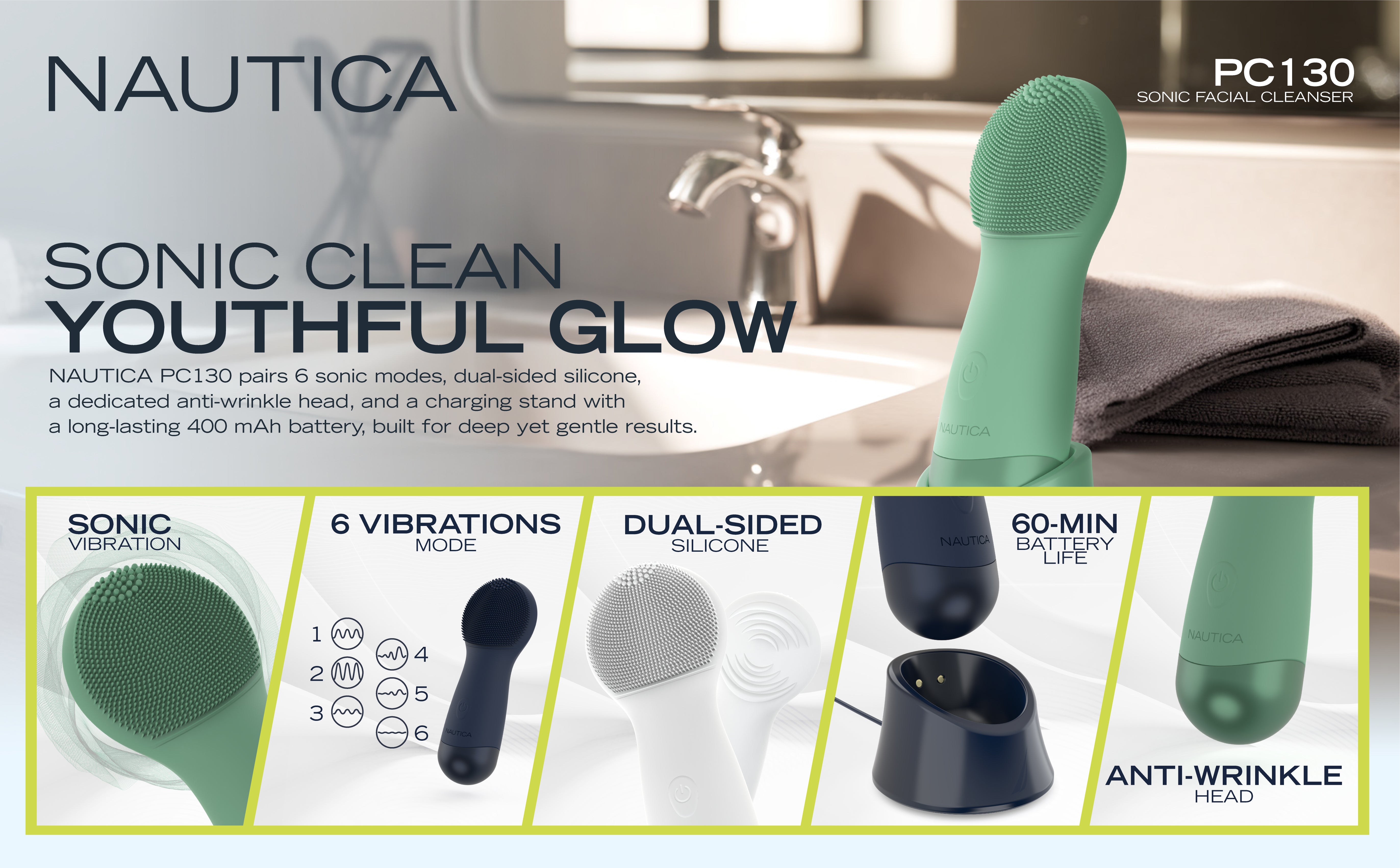 Nautica PC130 Sonic Facial Cleansing Brush Made with Ultra Hygienic Soft Silicone, Waterproof and Rechargeable Face Scrub Brush for Men & Women