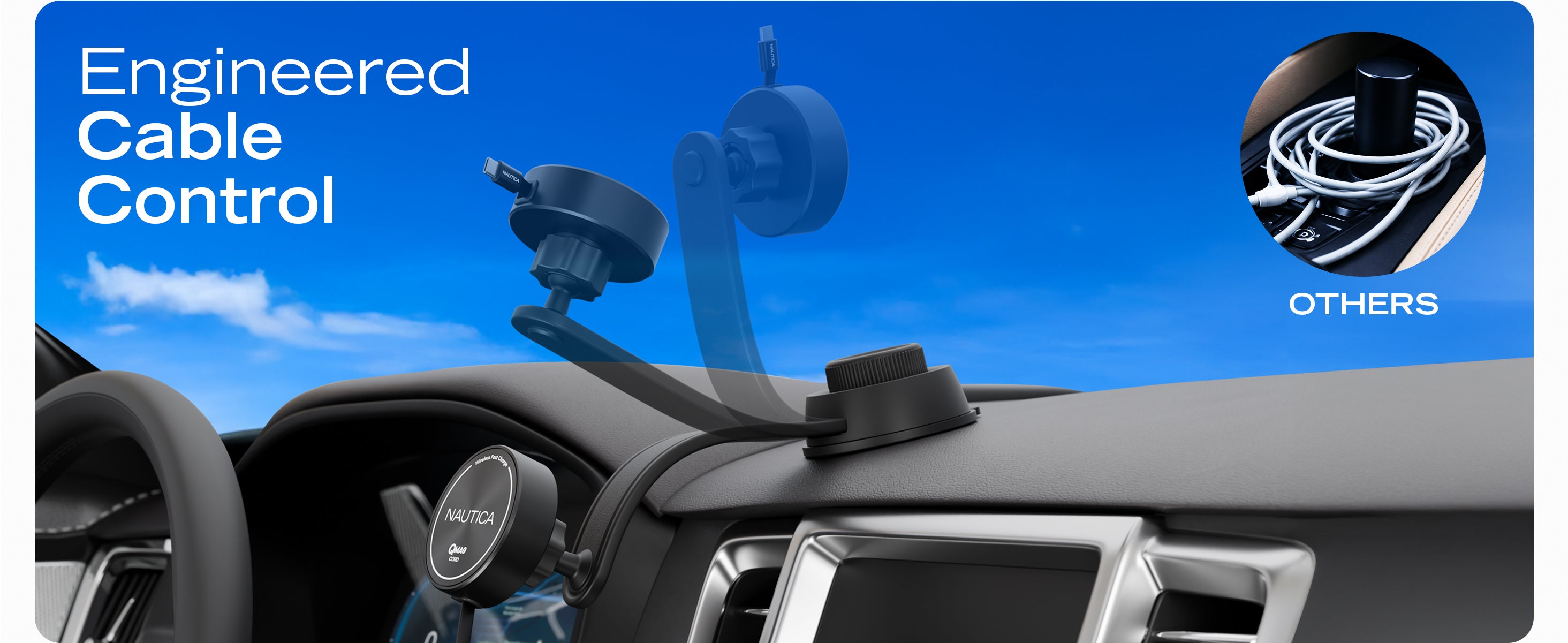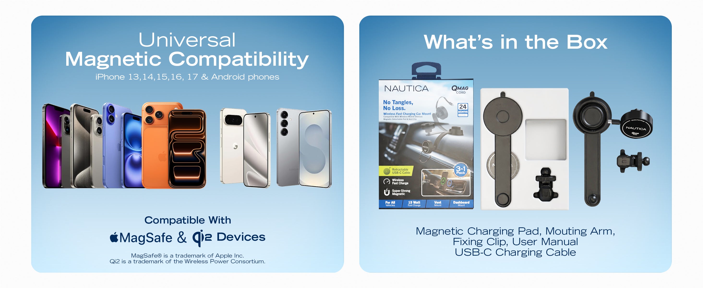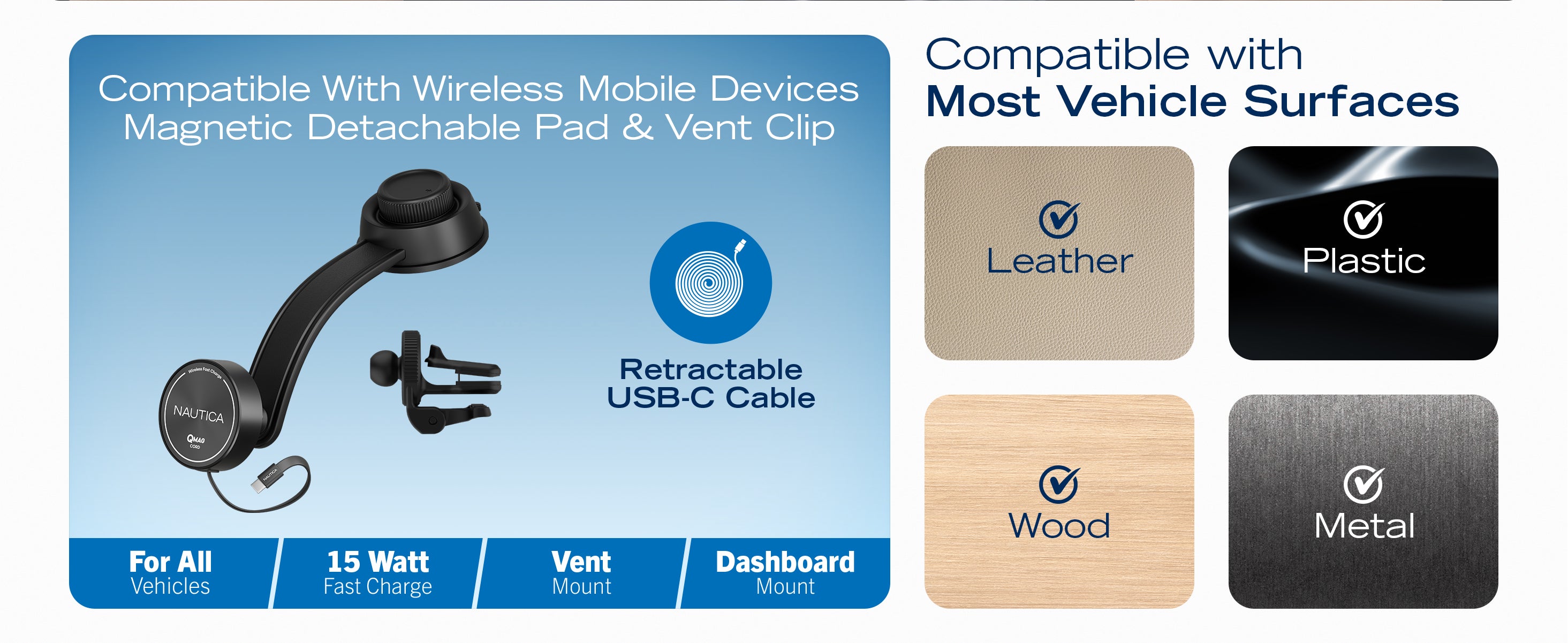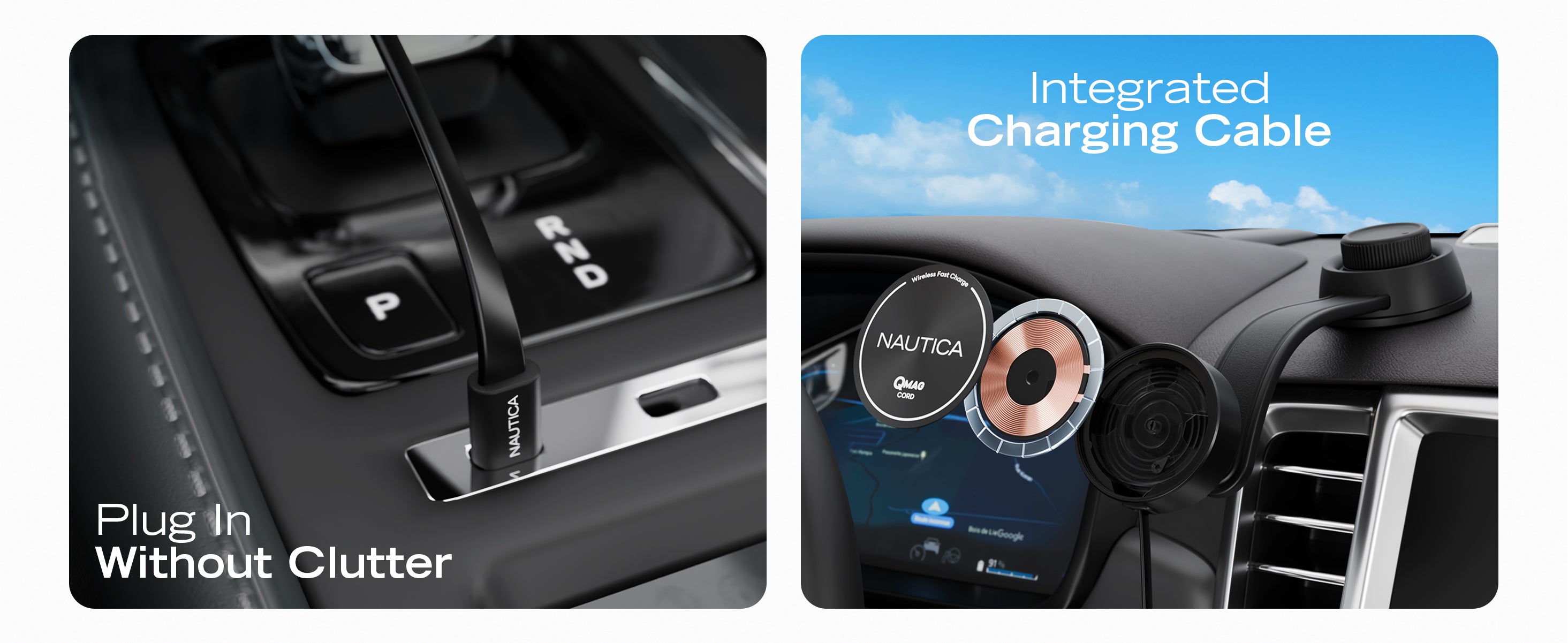 The Nautica Turan QMAG Lite Wireless Magnetic Car Charger with built in retractable USB C cable is designed to deliver reliable 15W wireless fast charging while keeping your phone securely mounted in your car. The integrated retractable cable removes the need for extra accessories and helps maintain a clean and organized driving setup.