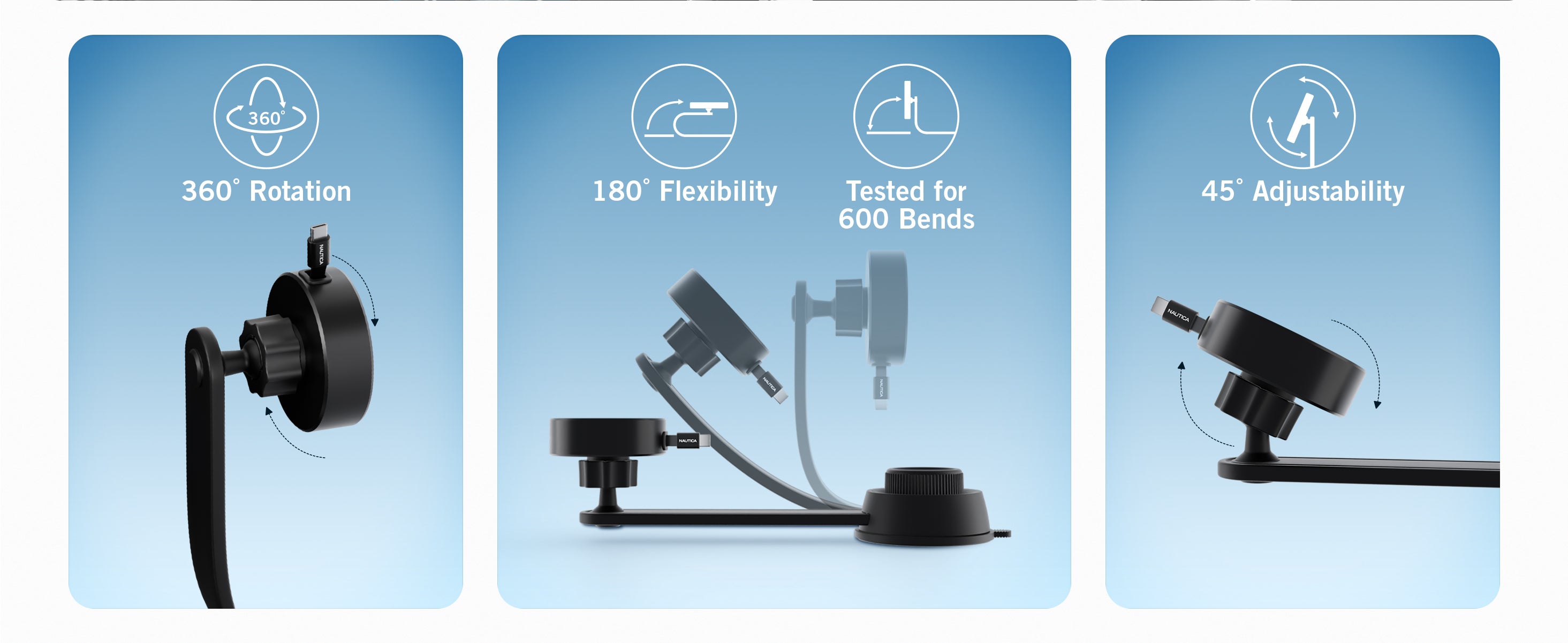 Dual mounting options for dashboard and air vent installation provide flexibility for different vehicles, while the fully adjustable 360 degree rotating head ensures a comfortable and safe viewing angle. Ideal for iPhone, Galaxy, Pixel and other compatible smartphones, the Nautica Turan QMAG Lite is a practical travel accessory designed for everyday convenience and efficient in car charging.