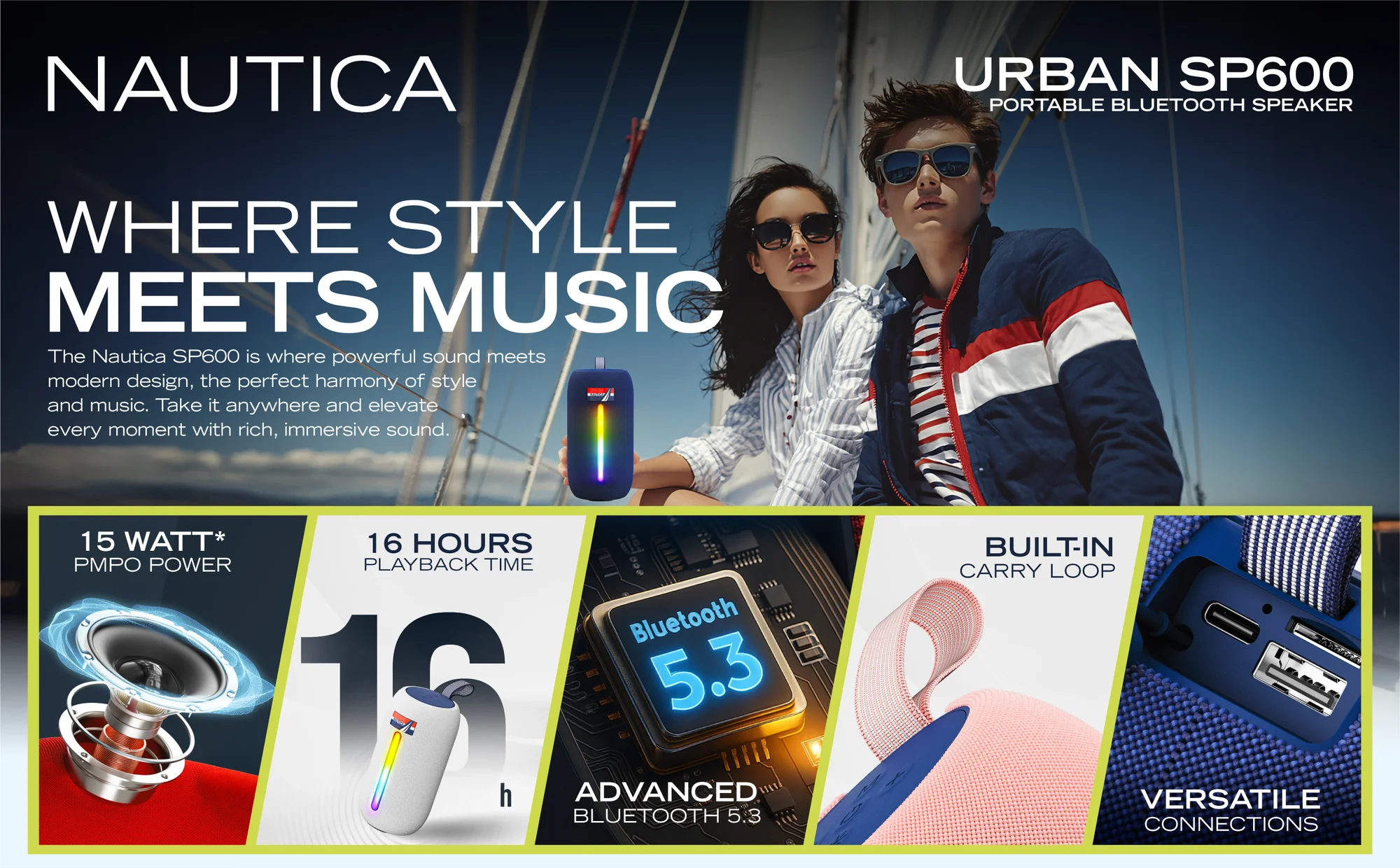 In addition to its sound quality and features, the Nautica Urban SP600’s stylish design brings a touch of modernity to your outdoor adventures. Its vibrant colors and sleek build make it not just a speaker but a fashion statement. Perfect for any setting, this speaker complements your outdoor gear and lifestyle.